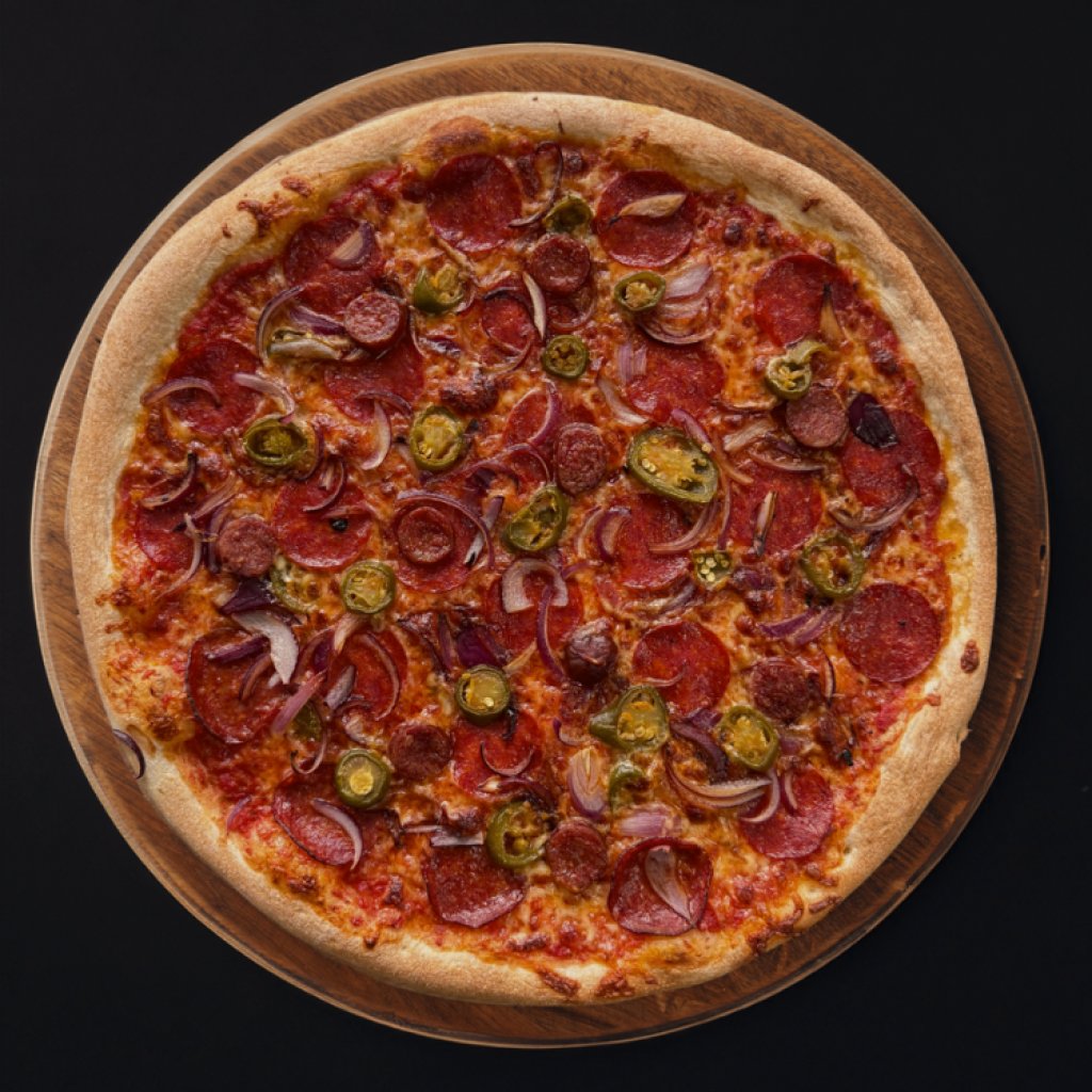 Tomato, sýr mozzarela, pikantní salám, papričky Jalaneňo, cibule, klobása.