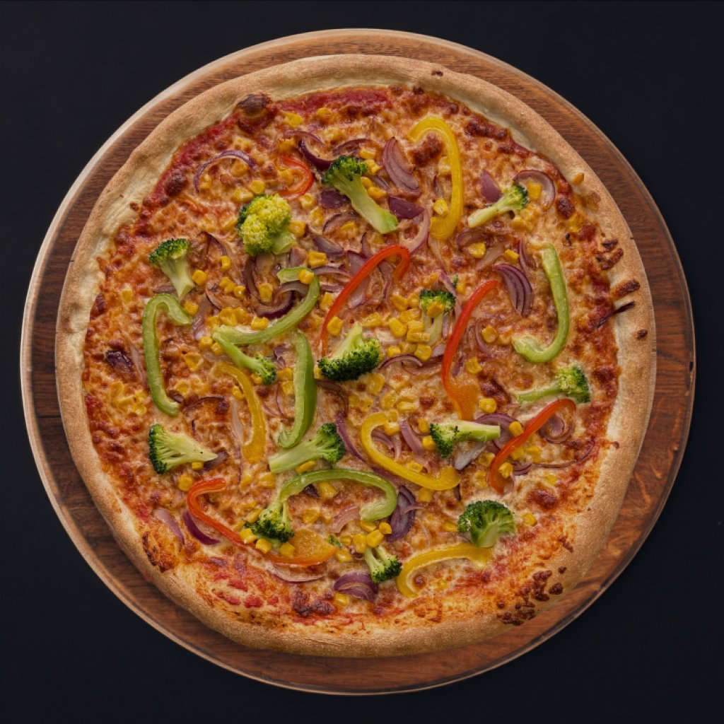 Tomato, sýr mozzarella, brokolice, paprika, červená cibule, kukuřice.