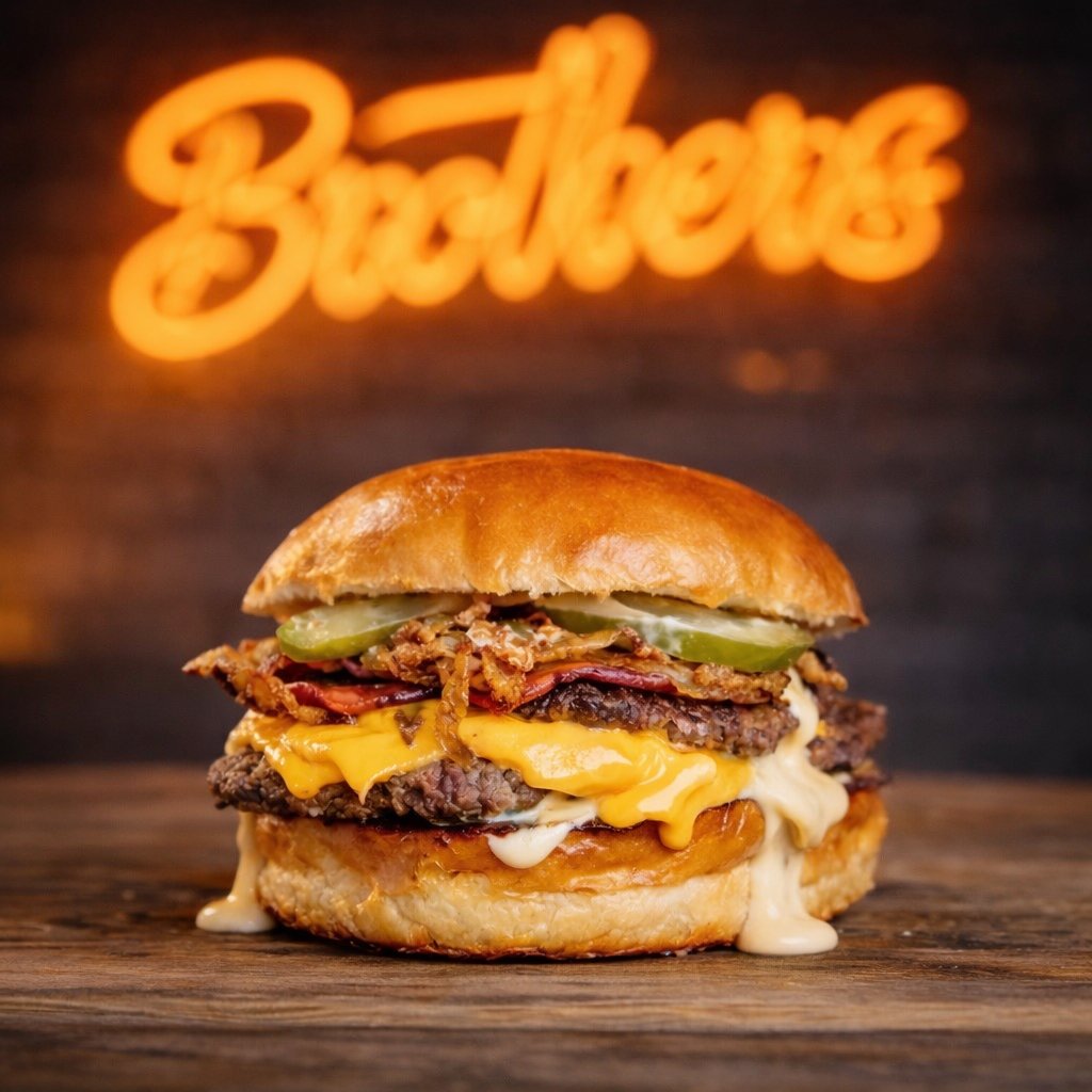 Dvojitá porce hovězího masa z rodinné eko farmy BREZE, dvojitý cheddar, domácí křupavá smažená cibulka, slanina, okurka, naše smash omáčka, bunska.